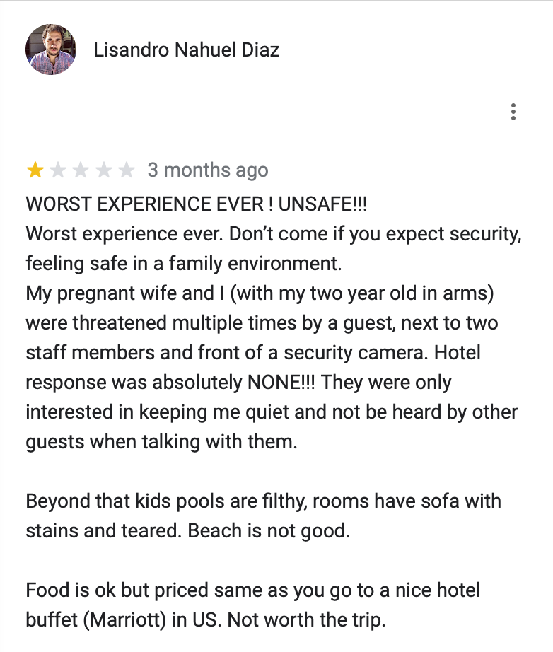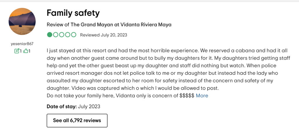 I am not the author of these safety concerns. I’m only highlighting them here to show that our family is not alone. While these assaults could happen at any resort, we find the lack of support from Vidanta security alarming.